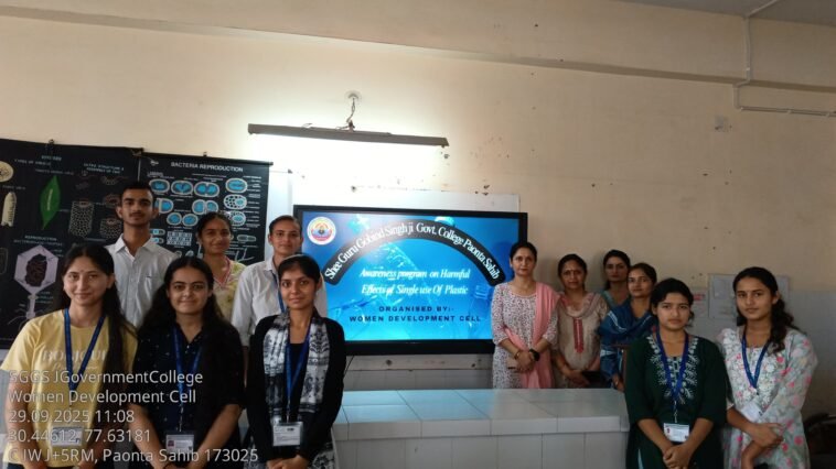 श्री गुरु गोबिंद सिंह जी राजकीय महाविद्यालय, पांवटा साहिब में महिला विकास प्रकोष्ठ ने एक विशेष जागरूकता कार्यक्रम का आयोजन किया, जिसका मुख्य विषय था ‘एकल-प्रयोग प्लास्टिक के हानिकारक प्रभाव एवं पर्यावरण-हितैषी विकल्पों का प्रोत्साहन।” इस कार्यक्रम में छात्रों ने पावरपॉइंट प्रेजेंटेशन के माध्यम से अपने विचार और शोध प्रस्तुत किए। छात्रों ने बताया कि एकल-प्रयोग प्लास्टिक न केवल जलवायुप्रवृत्ति संकट को बढ़ाता है, बल्कि जल, मृदा और वायु प्रदूषण का भी प्रमुख कारण है। इससे समुद्री जीवन और जैव विविधता पर भी गंभीर खतरा उत्पन्न होता है।