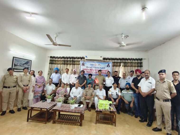 रोटरी क्लब पावंटा साहिब के प्रधान महेश खुराना ने अपनी टीम के साथ मिलकर आज”रोटरी संग पुलिस” नामक प्रोजेक्ट की शुरुआत की है। इस आयोजन के मुख्य अतिथि पावंटा थाना के एसएचओ देवी सिंह रहे और उनके साथ विशिष्ट अतिथि के रूप में नंज मेड साइंस के सीईओ मनमीत सिंह मौजूद हुए। इस प्रोजेक्ट के अंतर्गत रोटरी पावंटा ने पावंटा पुलिस को 50 हाई सिक्युरिटी (रिफलेकटिव) जैकीटस, 2 बड़ी सर्च लाइट, 5 ग्रीन- रेड टॉर्च,व हाई क्वालिटी 3M की रिफलेकटिव टेप प्रदान की। इस दौरान एसएचओ देवी सिंह ने बताया कि यह सामान आज के समय हमारे पुलिस व ट्रैफिक पुलिस कर्मियों के लिए जीवन रक्षक का काम करेगा।