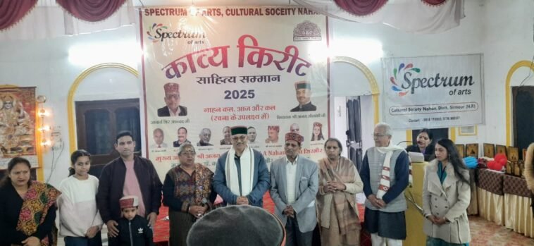 नाहन में स्पेक्ट्रम ऑफ आर्ट सांस्कृतिक संस्था द्वारा भाषा एवं संस्कृति विभाग के सौजन्य से काव्य किरीट सम्मान समारोह का आयोजन किया गया। इसकी अध्यक्षता महिला साहित्यकार शबनम शर्मा ने की। जबकि, नाहन के विधायक अजय सोलंकी ने मुख्य अतिथि के रूप में शिरकत की। प्रोफेसर अमर सिंह चौहान विशेष अतिथि के रूप में शामिल हुए। सबसे पहले संस्था की अध्यक्ष डॉक्टर शबाना सैय्यद व सचिव कुमारी नेहा ने संस्था के कार्यों के बारे में जानकारी दी।