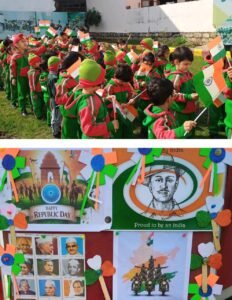 बच्चों ने राष्ट्रीय झंडे में वाटर कलर द्वारा थंब पेंटिंग कि इससे बच्चों को राष्ट्रीय झंडे के रंगों के विषय में जानकारी दी गई। स्कूल की अध्यापिका दिव्या ने गणतंत्र दिवस पर अपने विचार व्यक्त किय। उन्होंने बच्चों को बताया कि 26 जनवरी को कैसे और क्यों मनाया जाता है इस बारे में जानकारी दी और अपने देश के स्वतंत्रता सेनानियों के विषय में बताया। बच्चों ने नन्हा मुन्ना राही हूं जैसे देशभक्ति गानों पर नृत्य किया। अंत में सभी बच्चों को बिस्किट वितरित किए गए।